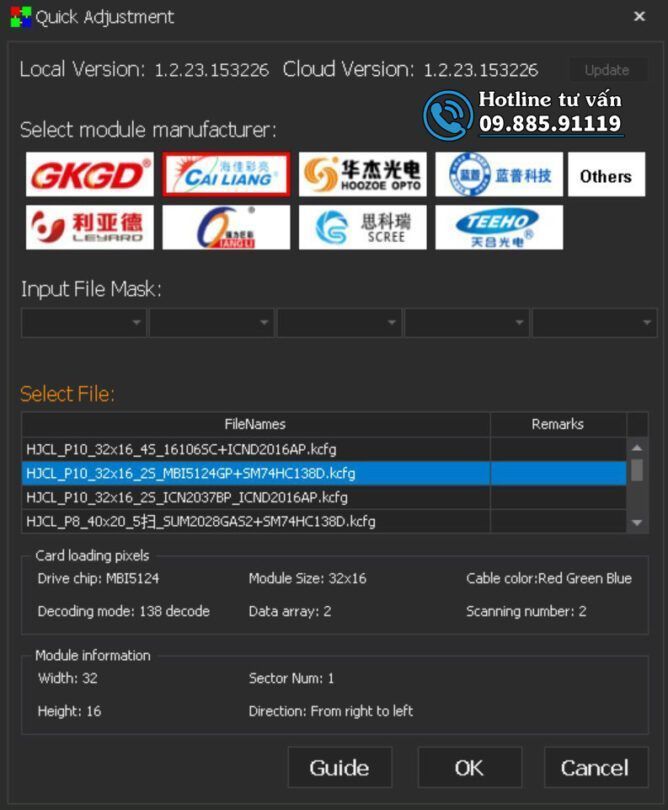 Bạn sẽ nhận được tệp cấu hình tương ứng của Module LED. Nhấp vào “cập nhật” để nhận tệp cấu hình mới nhất.
